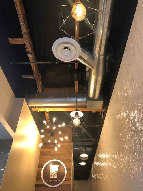This tea shop was designed with a fresh and clean look with the glass tile and quartz countertop for the tea prep area. Organic elements were used throughout the shop such as the leaf pattern wall tile and wood paneling used for the accent wall and also bar die. The brick wall was a nice rustic element to add to the space to complete the look.